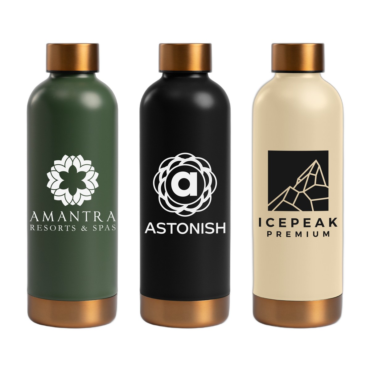 Meet the Astrid, a sleek and practical double wall stainless steel bottle designed for both hot and cold beverages. With a durable 201 SS outer body and a 304 SS inner body, it features vacuum insulation to maintain drink temperatures for up to 6 hours. The lid and bottom boast an elegant copper color finish, adding a touch of sophistication.This 18 oz. bottle is perfect for on-the-go hydration, whether you're keeping your coffee hot in the morning or enjoying a refreshing cold drink throughout the day. Please note, it is not suitable for dishwashers or microwaves. With a lightweight design weighing 296 grams and a spray-painted matte finish, the Astrid comes packaged in a polybag. Ideal for those who appreciate style and functionality in their everyday essentials. Complies with Prop 65. 9.06" H x 2.72" W
