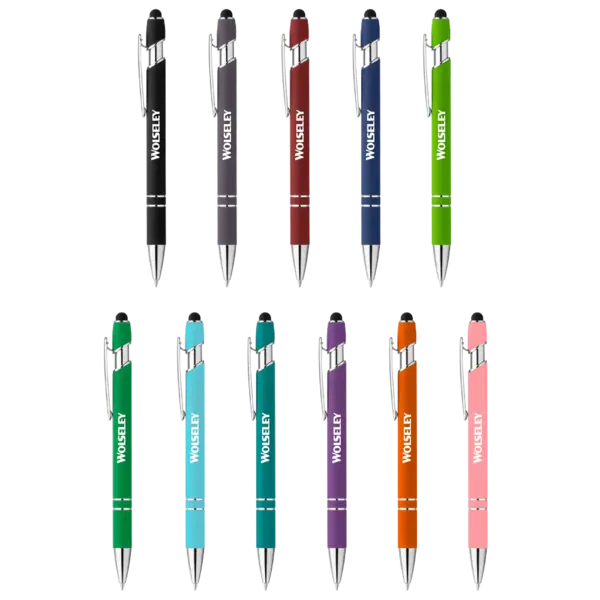 Plunge-action soft touch coated ballpoint pen with touch capacitive stylus tip. Color matched plunger; silver clip, tip, and accents; aluminum barrel. Black ballpoint ink. 5.5" D x 0.625" W