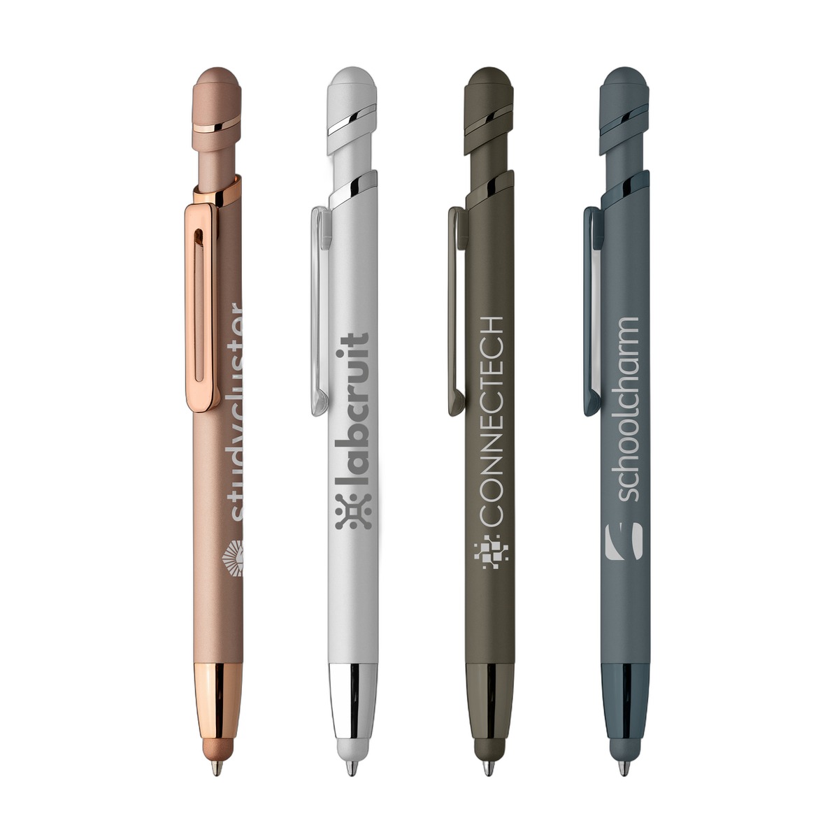The Atlantic Softy Metallic metal pen features a contemporary monochromatic design, with luxurious soft-touch barrels complementing color-matched metallic trim for a fresh, modern look. The capacitive stylus adds useful touchscreen functionality. . Complies with Prop 65. 5.39" W x 0.39" D