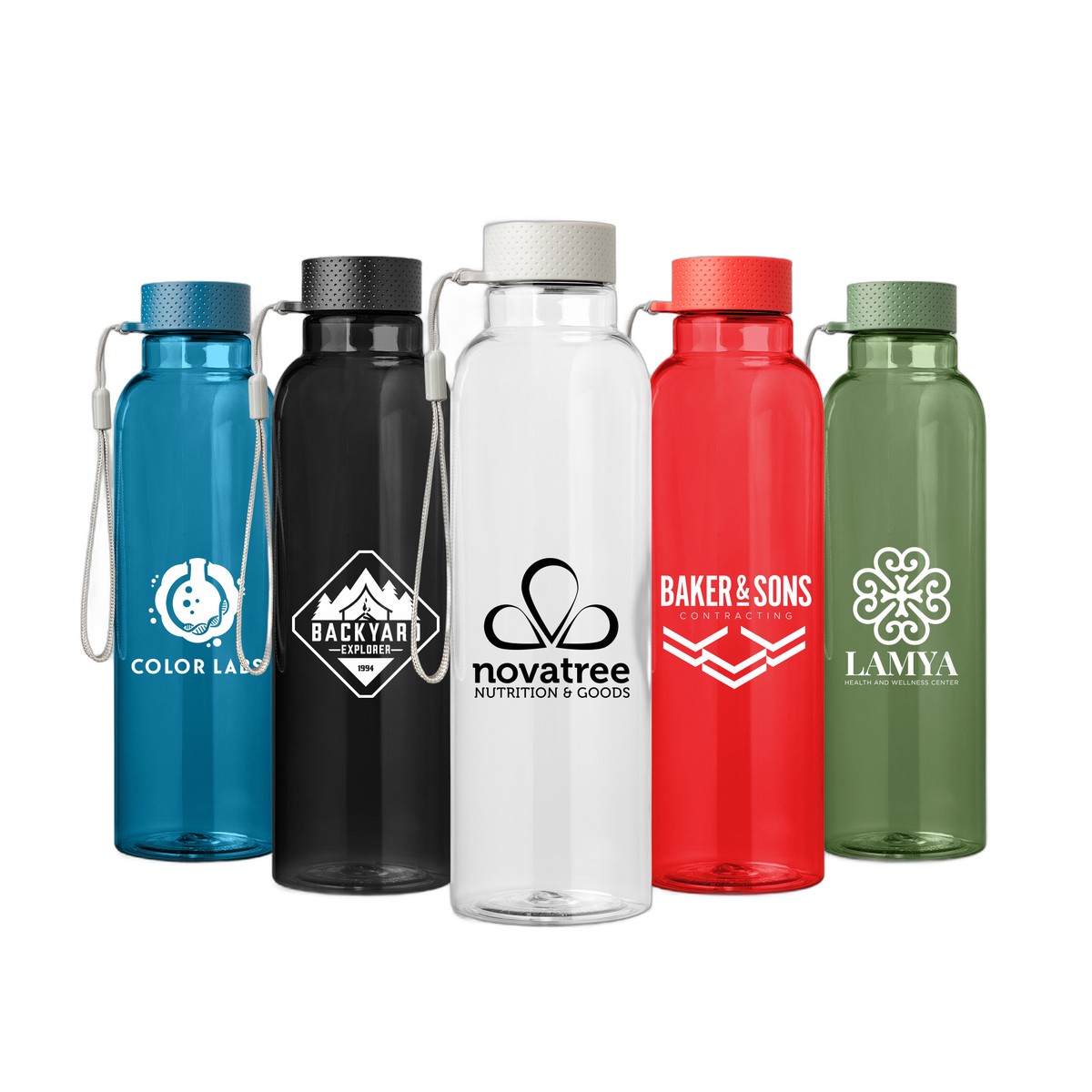 Aura rPET Wrist Strap Bottle - 24 oz. is a single-wall bottle with a translucent finish, made from recycled PET. It features a leakproof, textured screw-on lid with a matching color and an attached strap for easy carrying. With a capacity of 24oz, this bottle is ideal for cold drinks only. It is not suitable for dishwashers or microwaves, making it a practical and durable choice for everyday use. Complies with Prop 65. 9.53" H x 2.76" W