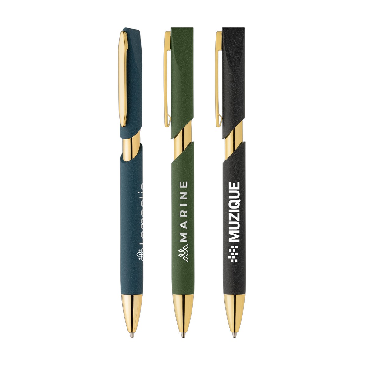 Meet our premier Aurelia Pen, a distinguished writing instrument with a new, exclusive shape. This retractable ballpoint pen's barrel is made from recycled ABS plastic (rABS) and features a unique stone painted finish on the barrel, lending it a premium, textured feel. The aesthetic is elevated by shiny gold accents on the pen tip, plunger, and clip. It is equipped with a black German Dokumental ink slim refill that delivers smooth writing through a 1.0mm tip and offers an impressive 600-meter write out length. This pen offers a blend of stylish design and reliable performance in colors like black, navy, and green. 5.71" W x 0.39" D