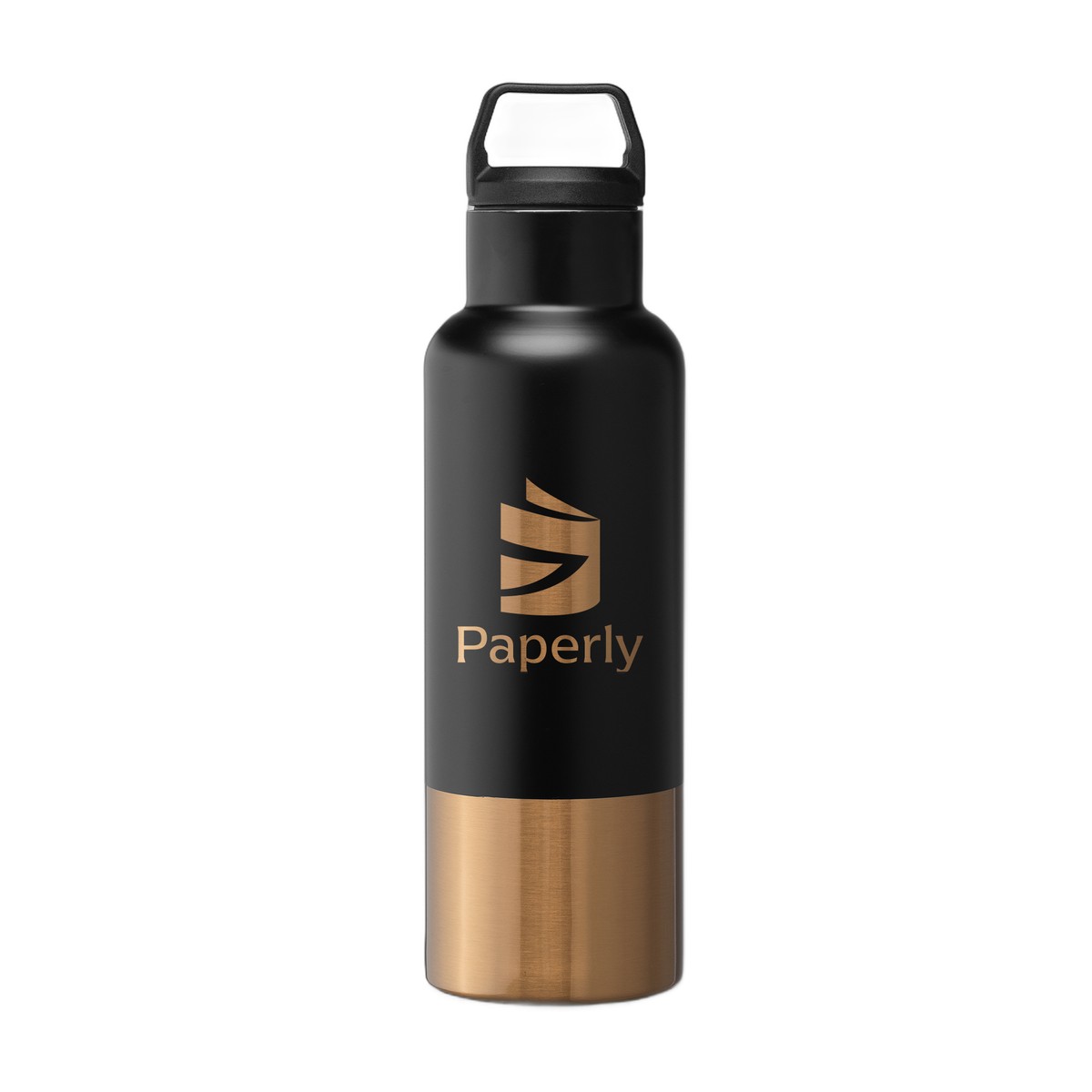 Experience elite temperature control with the luxurious Aurelia. This premium bottle, part of the gold accented collection, is crafted with double-wall vacuum insulation using recycled stainless steel (post consumer recycled stainless steel - 304 SS inner, 201 SS outer). It's engineered to keep drinks hot or cold for up to 15 hours. The 22.5 oz. (640 ml) bottle features a unique, gold-layered body underneath a matte black powder-coating finish. This design is specifically created to allow for striking gold-color laser engraving, offering a high-end branding opportunity. The leakproof polypropylene plastic screw-on lid includes a convenient carry handle. This bottle is BPA-free, durable, and perfect for carrying both hot and cold beverages in style. 10.04" H x 2.87" W