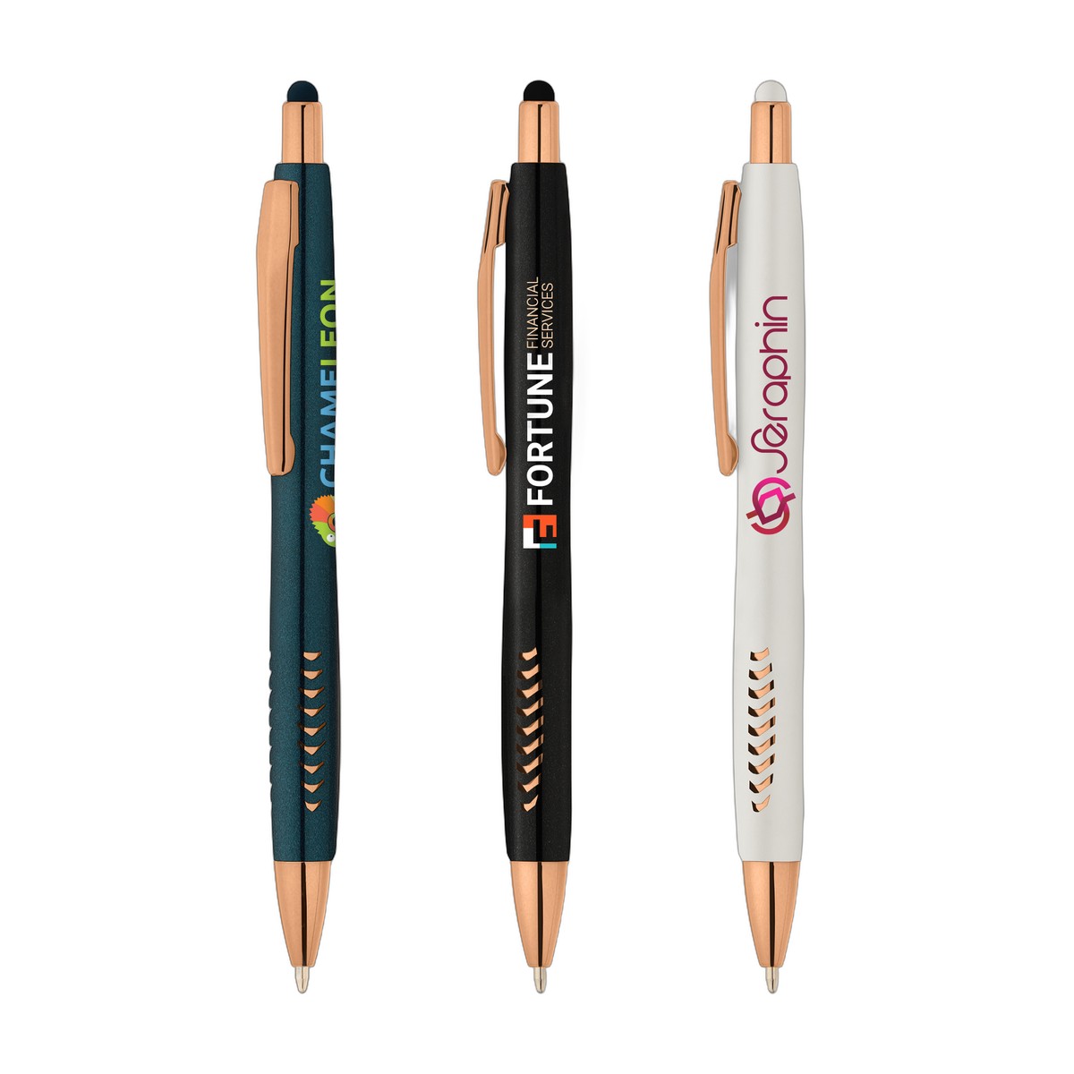 The Avalon Pearl Rose Gold with Stylus features eye-catching rose gold accents that shine next to pearlescent painted barrels. This pen has a triangular grip with metallic rose gold vents built into the barrel for ergonomic writing comfort. The retractable plunger includes a stylus for use on touchscreen devices. Show your brand's true colors with ColorJet, our full-color inkjet imprint process. Complies with Prop 65. 5.62" W x 0.41" D