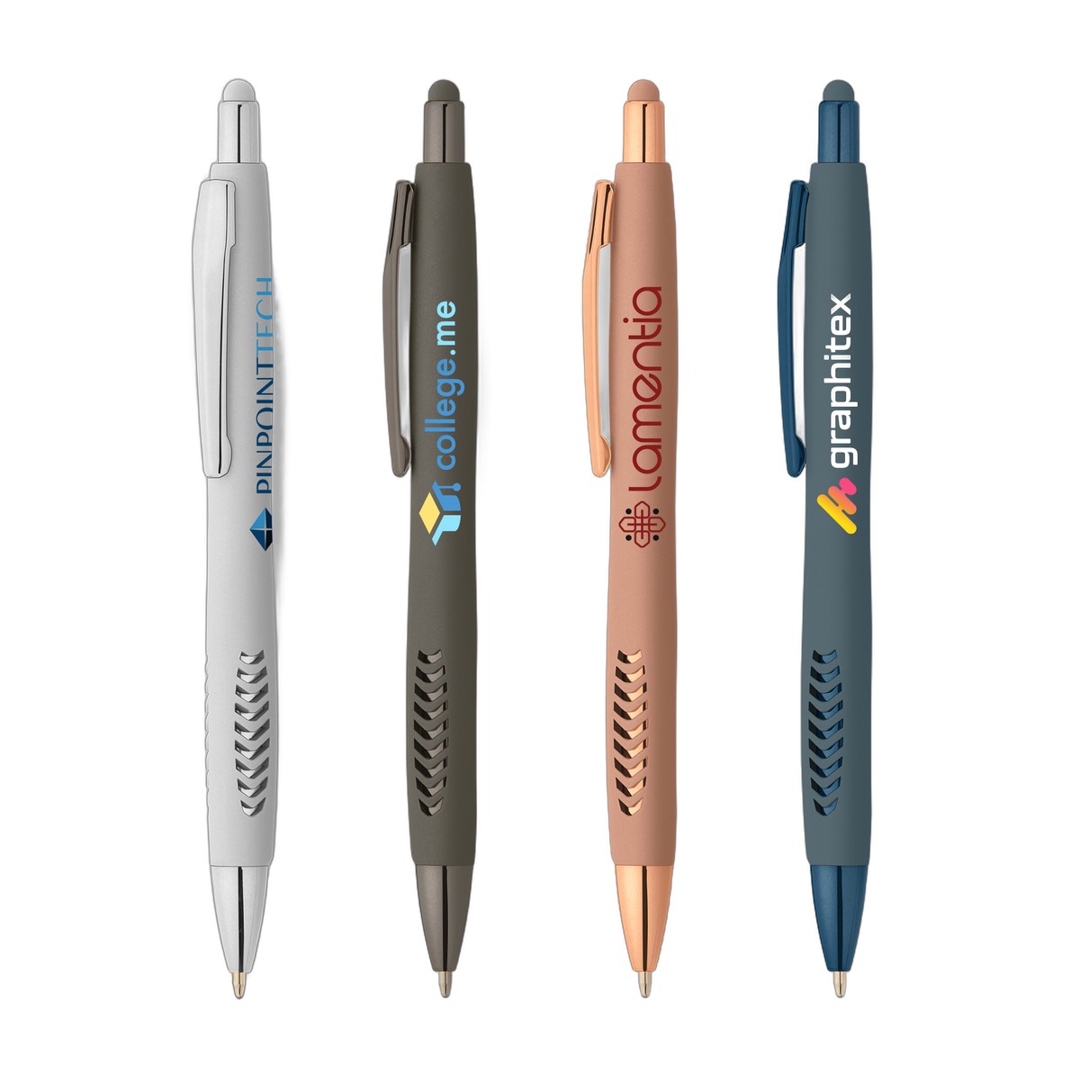 The Avalon Softy Metallic plastic ballpoint pen features eye-catching chrome accents and a sophisticated soft-touch finish on metallic barrel colors for a stylish appearance. A touchscreen stylus, a uniquely shaped, ergonomic barrel, and an aerated/vented grip add to the branding experience. Available in black writing ink. Show your brand's true colors with ColorJet, our full-color inkjet imprint process. Complies with Prop 65. 5.62" W x 0.41" D