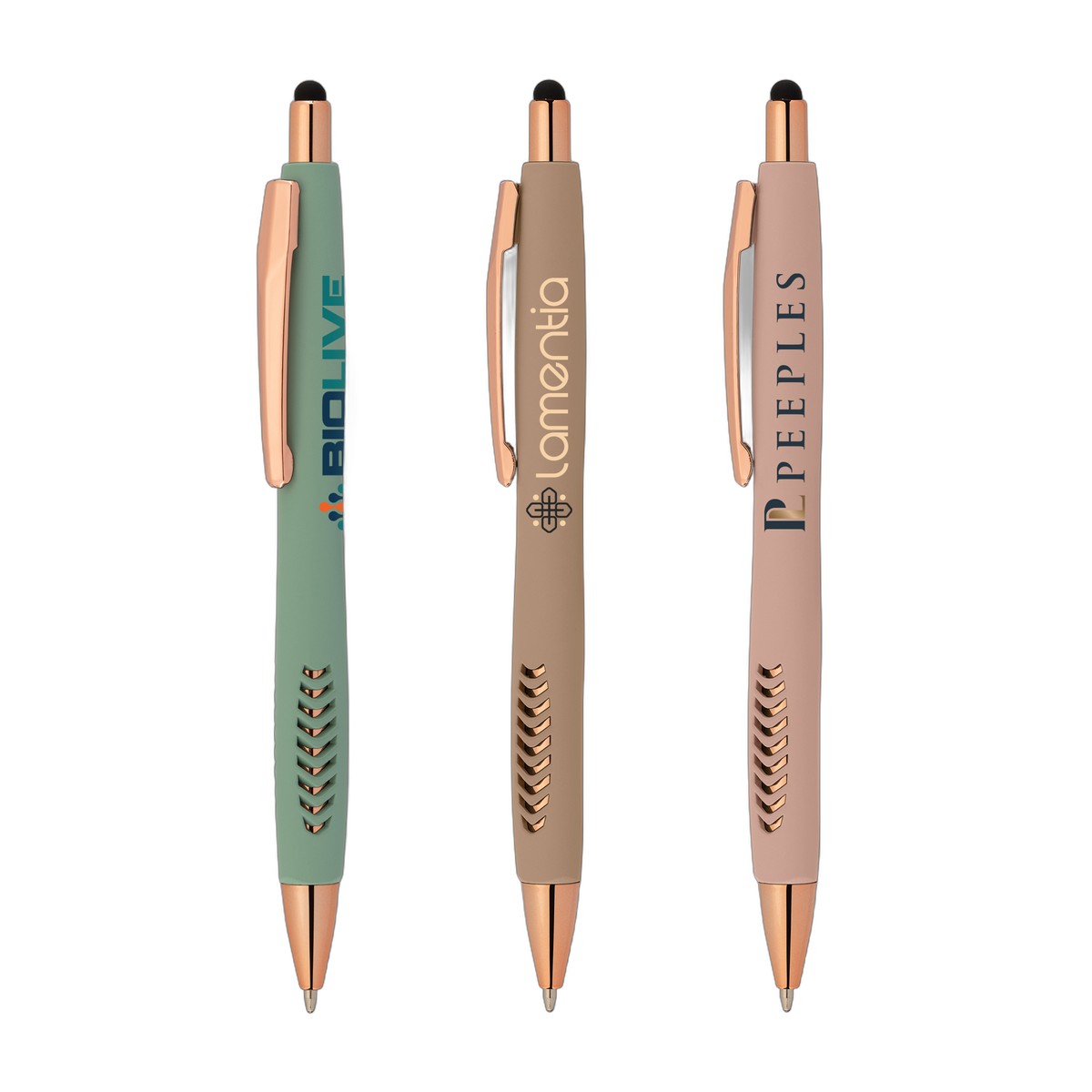 Presenting our Avalon Softy Rose Gold Designer Pen with Stylus – Featuring a luxurious soft touch finish and a rose gold die-cut pattern in the grip designed in a triangle shape, this pen effortlessly combines style and comfort. The barrel is expertly crafted from ABS plastic with a rubber finish, and the rose gold trim adds a touch of elegance to the tip, plunger, and clip. A black stylus is included for added functionality. Your logo will be imprinted in Full ColorJet. Complies with Prop 65. 5.62" W x 0.41" D