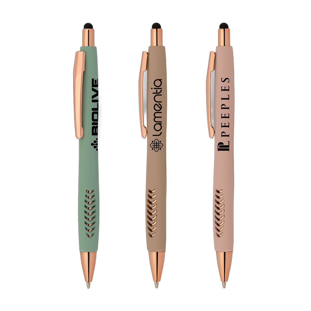 Presenting our Avalon Softy Rose Gold Designer Pen with Stylus – Featuring a luxurious soft touch finish and a rose gold die-cut pattern in the grip designed in a triangle shape, this pen effortlessly combines style and comfort. The barrel is expertly crafted from ABS plastic with a rubber finish, and the rose gold trim adds a touch of elegance to the tip, plunger, and clip. A black stylus is included for added functionality. Your logo will be imprinted in Full ColorJet. Complies with Prop 65. 5.62" W x 0.41" D