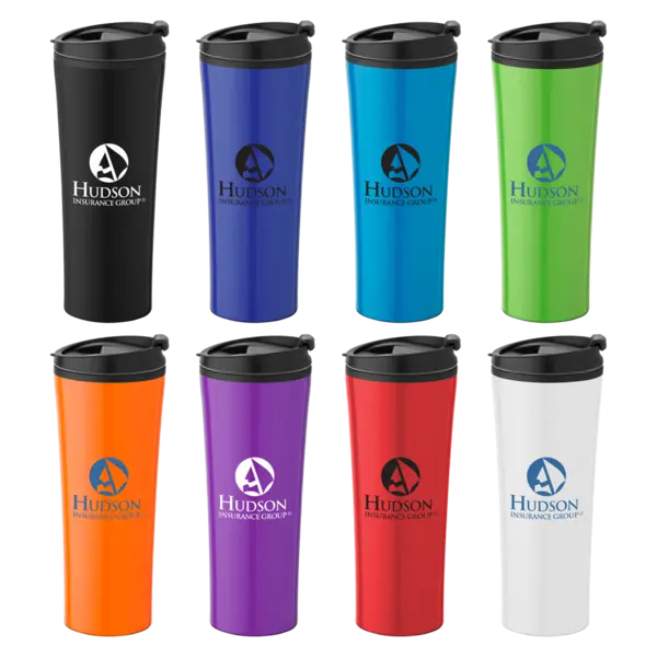 16 Oz. Double wall insulated tumbler; high gloss coated stainless steel exterior, black PP inner. Black threaded no-spill snap-top lid with silicone gasket for a secure seal, no skid bottom. Not microwave or dishwasher safe. 7" H x 3.0625" W