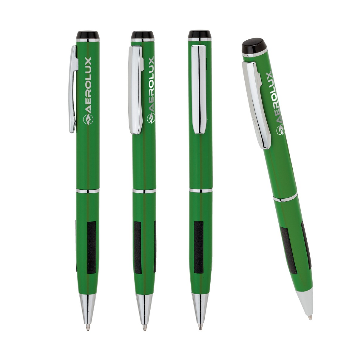 Solid color brass pen with soft rubber grip bars and chrome accents. Twist action mechanism. Complies with Prop 65. 5/8" W x 5 3/8" H x 1/2" D
