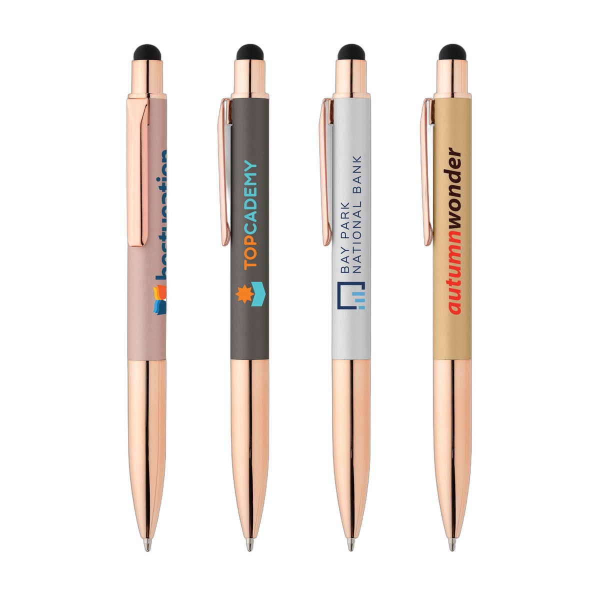 The Baltic Softy Rose Gold Pen features luxurious soft-touch finish in rich, metallic colors on the barrel, the perfect complement to the polished rose gold nose cone, trim and clip. A convenient touchscreen stylus is also included. . Complies with Prop 65. 5.59" W x 0.43" D