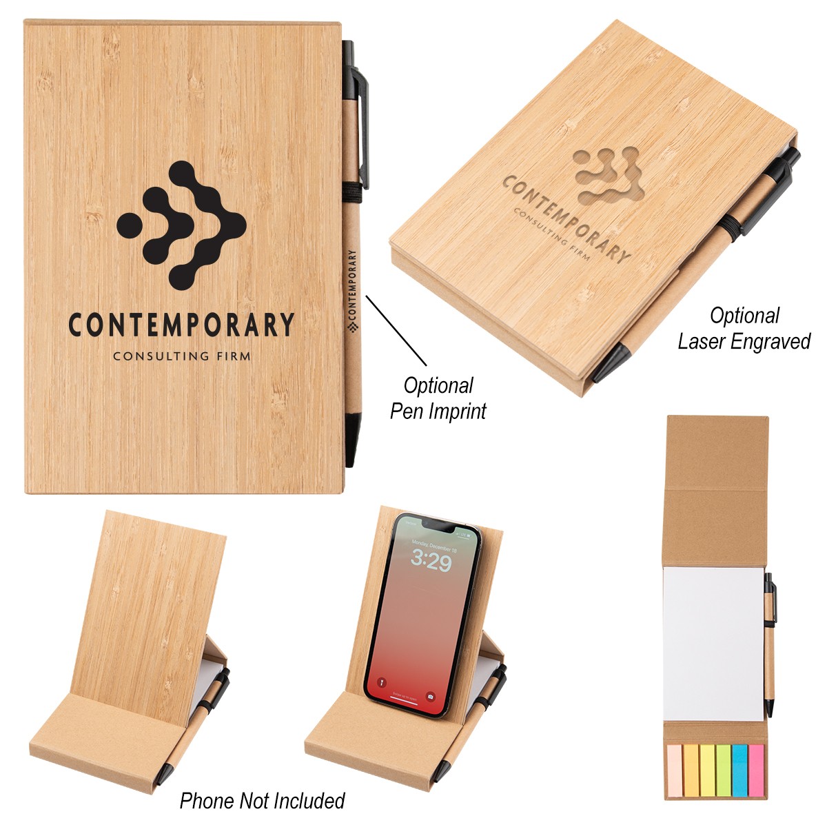 70 Page Unlined Notebook. Matching Pen Has Paper Barrel In Elastic Pen Loop. Sticky Flags In 6 Neon Colors. Cover Doubles As Phone Stand. Holds A Variety Of Phone Sizes For Easy Viewing. 4" W x 6" H