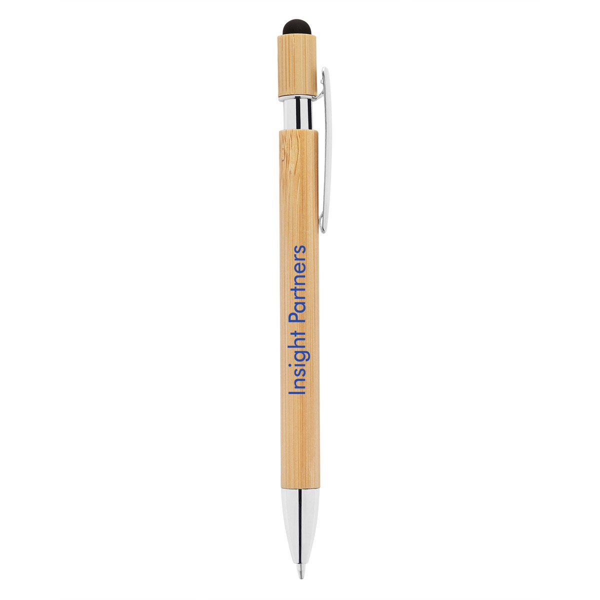 Push action Bamboo pen with Silicone stylus tip for touch screen devices. Chrome and color accents with Iron clip. Black, medium point ink. 5.6000" L x 0.4000" Diameter