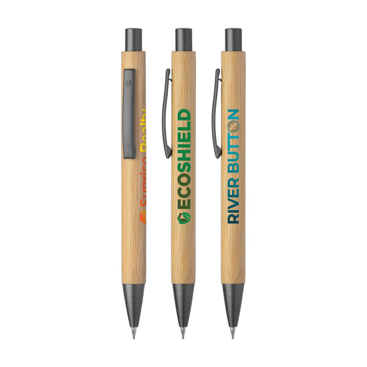 The Bambowie Mechanical Pencil features a barrel made of renewable bamboo, and nose cone and plunger made with 50% recycled plastic, with gunmetal finish. The mechanical pencil dispenses No. 2 lead and comes with two lead refills. The Bambowie Pencil is an excellent tool to promote your brand in an environmentally-friendly way, and it's perfect for the precise needs of architecture and engineering firms, science and math education, educator conferences and seminars, companies looking to enhance eco-awareness and more. Your full-color logo will look amazing when . Complies with Prop 65. 5.39" W x 0.47" D