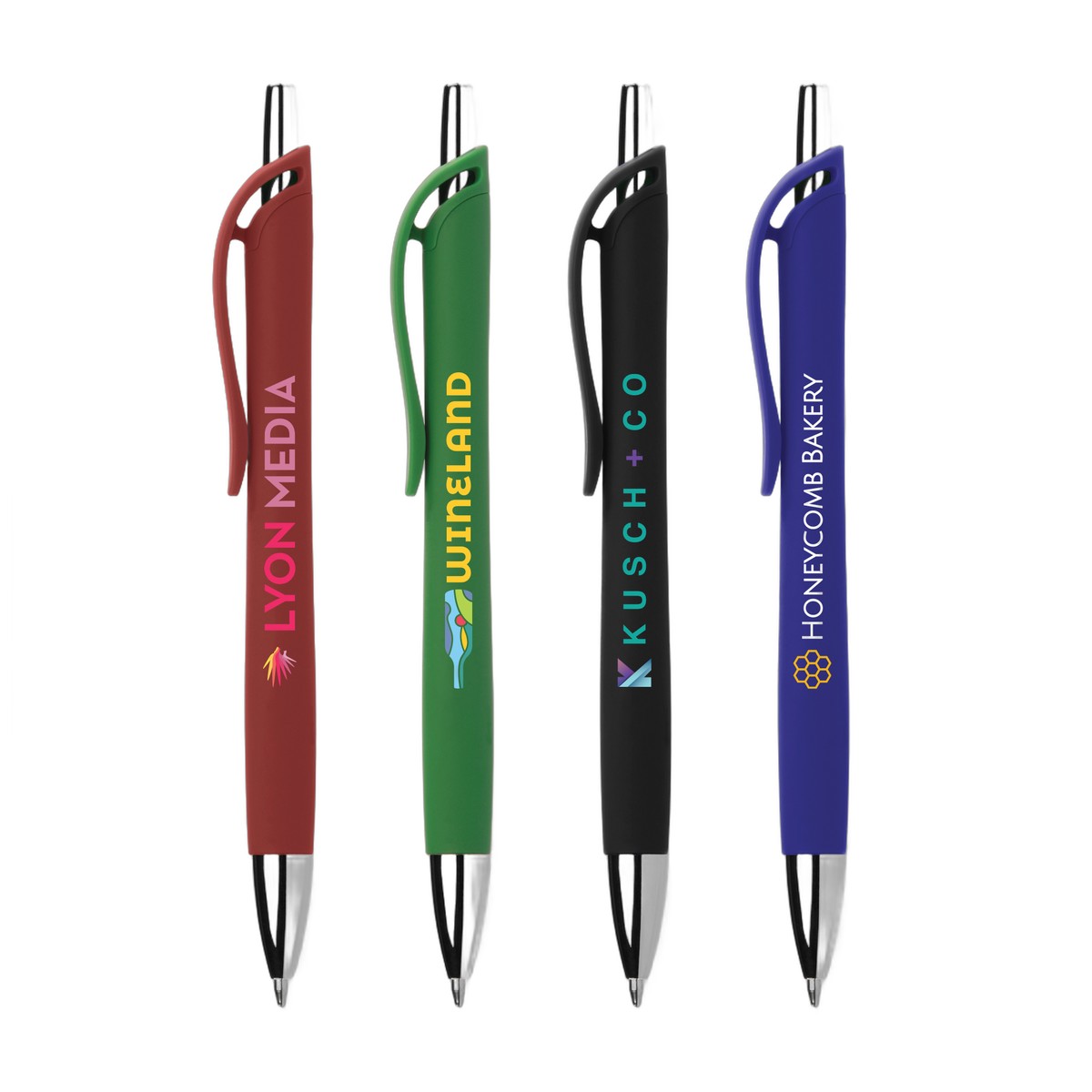 This plastic ballpoint pen features bright chrome accents and a comfortable, rubberized soft-touch finish that coats the barrel and clip. Choose from a variety of popular colors to . An excellent giveaway item! Complies with Prop 65. 5.68" W x 0.46" D
