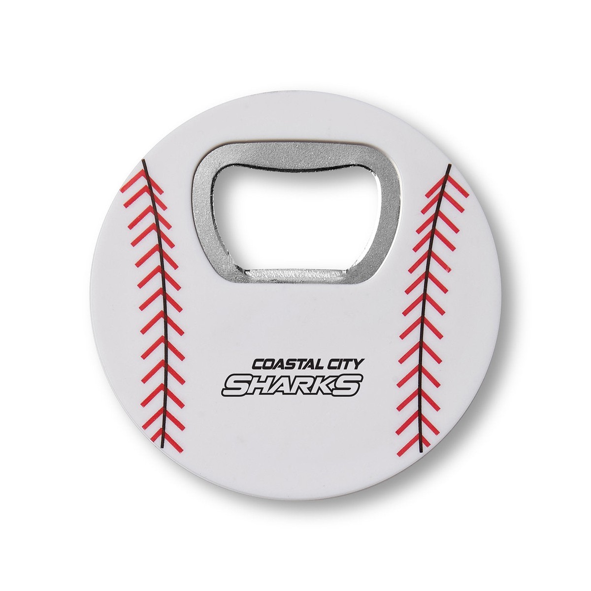 Baseball sports ball-shaped bottle opener. Features baseball stock art stitching pre-printed on both sides. Made of durable ABS plastic with stainless opener insert. Features heavy duty magnet on back to store on refrigerator and other metal items. Designed for opening bottles and flip-top cans. 0.17" D x 2.75" Diameter