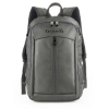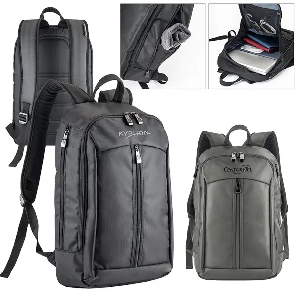 The everyday - go anywhere compact backpack! Sporty black 1680 Cross Weave material backpack, Large front vertical zippered pocket, Main compartment with dual-zipper closure, 2 Side zippered catch-all pockets, Padded top handle, Adjustable shoulder straps. Fits most 14" laptops.