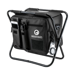 Waterproof 600D × 600D body and aluminum frame portable camping stool with built-in insulated PEVA-lined main cooler compartment with space for 24 cans. Includes labeled pockets for a cellphone and a flashlight, a drawstring cup holder, a business card/ID, and retractable bottle opener. Design details include MOLLE and mountaineering webbing and a hook and loop patch panel for affixing morale patches (patch not included). Adjustable/detachable padded shoulder strap makes transportation a breeze. 15.5" D x 17.25" H