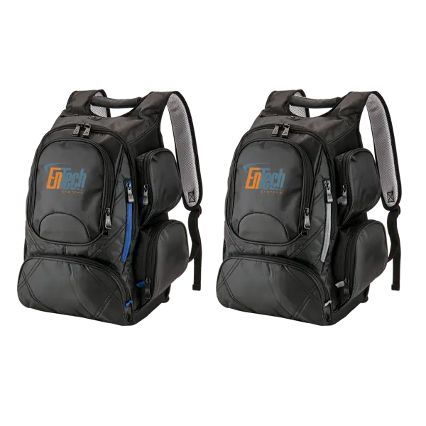 420D/Dobby backpack with matte PU accents and quilted accent bottom pocket. Features a RFID compartment to help keep your identity safe; TSA friendly back padded laptop compartment; organizer pockets; soft mesh water bottle pocket; side pockets; padded shoulder straps; easy to carry PU wrapped top handle with contrast color accent; air mesh padded back with quilted luggage trolley pass. Organizational pockets and key fob leash. Icon patches to indicate the tech areas. Fits most 15" laptops. 8.5" D x 20" H x 15.25" W