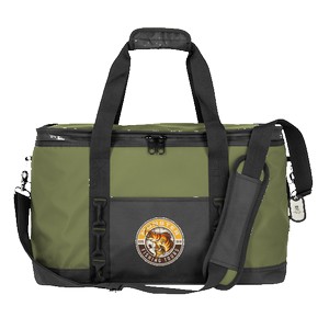 Water-resistant tarpaulin cooler bag with thick foam padding insulation. Features a zip around wide top opening with a water-resistant ghosted Basecamp printed zipper; 420D polyester front open pocket; double webbing straps, with hook and loop wrap handle; attached gunmetal bottle opener and hardware; adjustable shoulder strap that extends to bottom for increased durability, with ergonomic shoulder pad with slip guard underneath; 36 can capacity; includes decorative Basecamp dog tag. 19" W x 9.5" L x 11.5" H