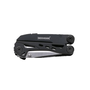 11-in-1 420 stainless steel with anodized aluminum handle multitool. Includes needle nose pliers, regular pliers, wire cutters, locking knife, can opener, flat screwdriver, file, wood saw, bottle opener, seat belt cutter, fire starter, and whistle. 4.5625" D