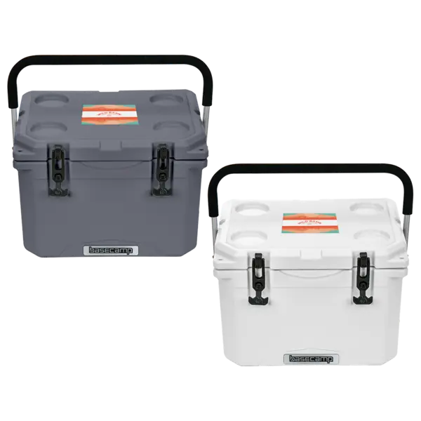 Meet the Basecamp Ice Block 20 Cooler. Roto-Molded to produce the highest quality product possible, the Ice Block 20 contains twice the insulation of a typical ice chest. The end result is a water tight cooler that holds ice solid for days and days. This 20L cooler features a cup-holder lid for four, a padded carrying handle for easy transportation, rubber lug latches for security with additional padlock points for creature-proofing, and a convenient drain port for easy clean up. 19.7" D x 13.4" H x 15.333333" W