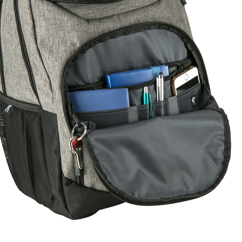 Heathered 300D/PVC polyester with 600D/PVC and 210D/PU lining backpack. Features two main compartments. Padded laptop and tablet pockets; front zip catch-all pocket; front organizational pocket; felt lined media pocket; air mesh back panel with luggage trolley pass; padded adjustable straps. 8.5" D x 19" H x 13.5" W
