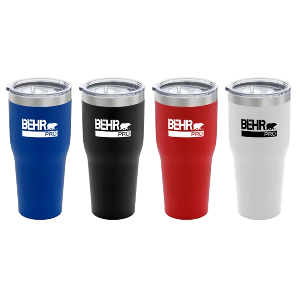 30 Oz. Vacuum insulated double wall tumbler with clear AS pressure lid. 18/8 powder coated stainless steel with copper lining; fits in standard cup holders. Not microwave safe; hand wash only. Packaged in retail box. 8.6" H x 4.125" W