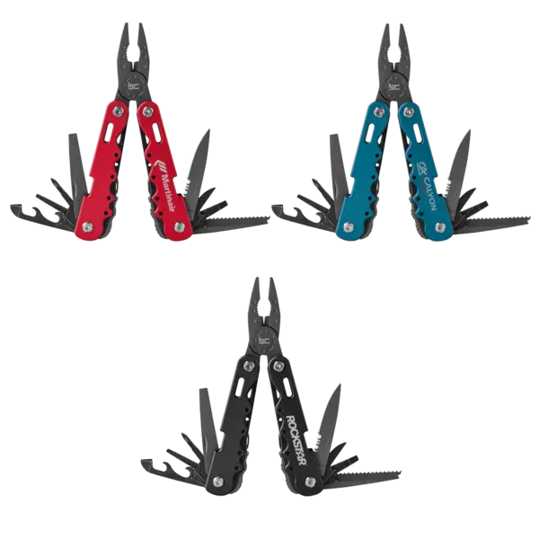 13-in-1 420 stainless steel and anodized aluminum multi-tool with: needle nose pliers, regular pliers, wire cutters, 440 drop-point knife, file, saw, small flathead, medium flathead, large flathead, can opener, bottle opener, Phillips, and hook disgorger. Housed in heavy duty nylon sheath with large hook and loop closure and belt loop (included). Sheath includes MOLLE friendly webbing. 4.1" D