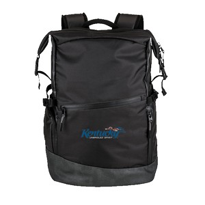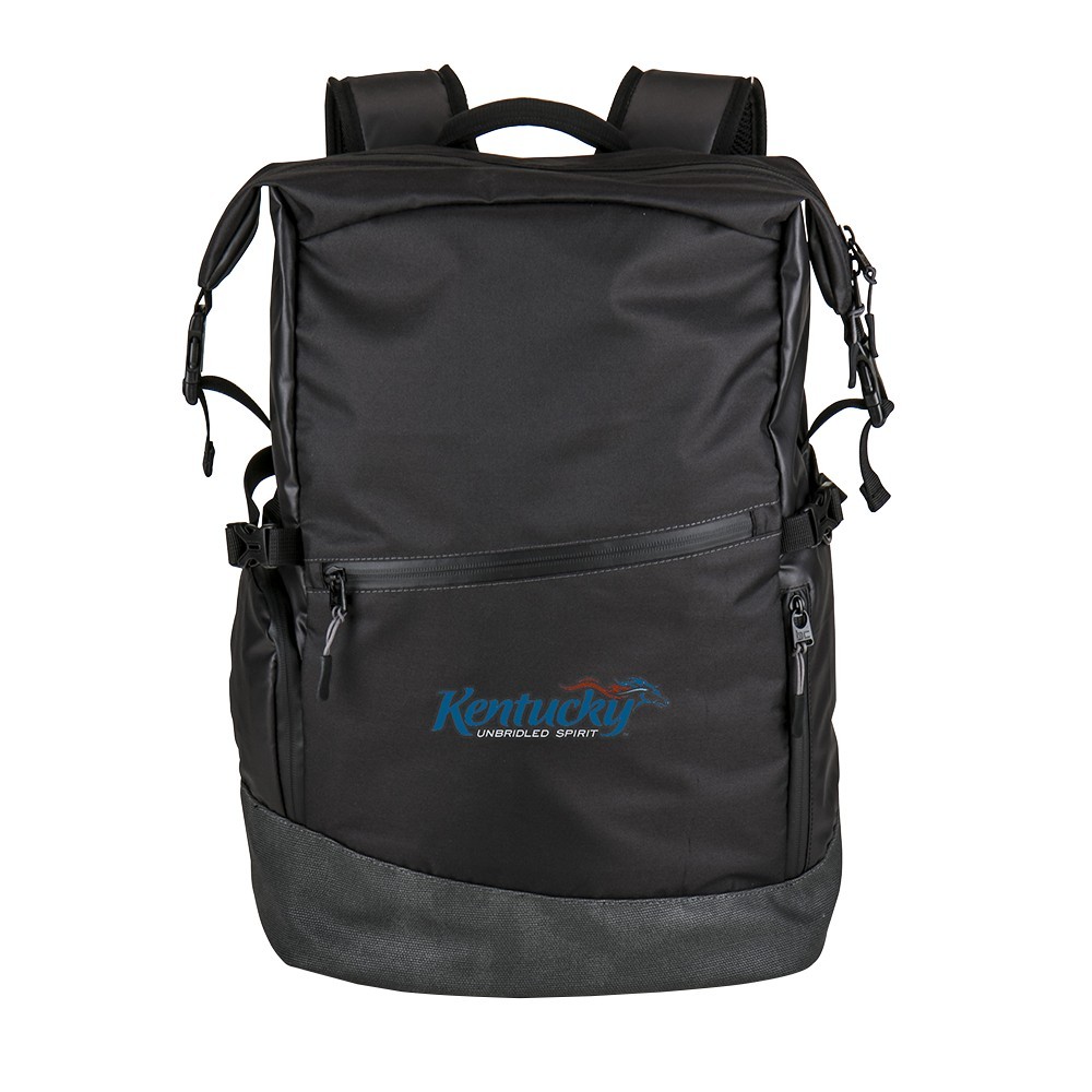 Adventure-friendly 300D/PU polyester water-resistant backpack with 210D/PU polyester lining and textured leatherette bottom. Features padded laptop compartment, organizational and zippered pockets, felt-lined eyewear pocket, and hidden zippered pockets. Includes an adjustable sternum strap, airmesh padded shoulder straps, air mesh back cushioning, and trolley pass. Modern buckle-down top with zipper closure. 6.5" D x 17.75" H x 11.75" W