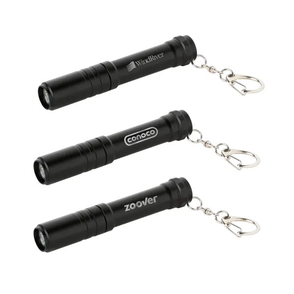 Ultra-bright LED flashlight keychain. Aircraft grade aluminum housing with reduced rolling design; 75 lumen LED; twist head for on/off; requires 1 AAA battery (included). 3.5625" D x 0.625" W