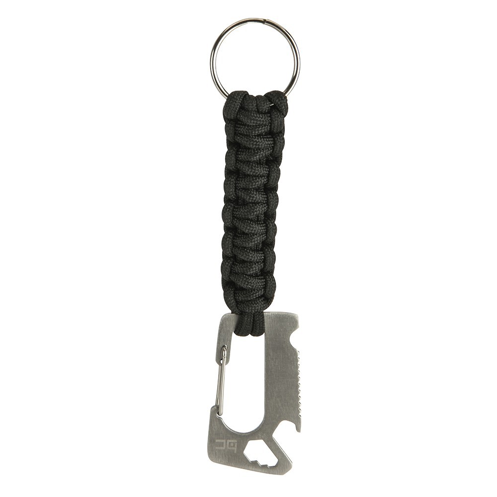 7-in-1 multi-tool carabiner with black paracord includes ruler, 4/6/8mm wrench, bottle opener, file, cord cutter, and flathead screw driver. Silver split ring included. 5.875" D x 1.3125" W