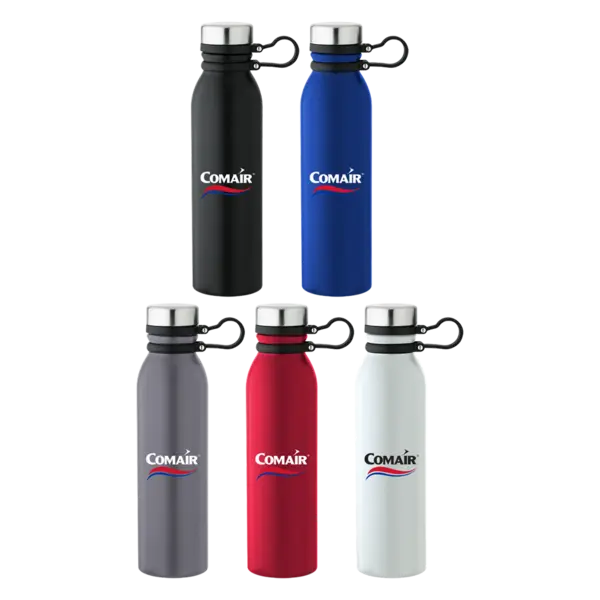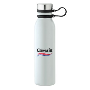 24 Oz. Double-wall stainless steel vacuum insulated bottle. TPR strap keeps screw top lid attached to bottle and doubles as an easy carry handle. Powder coat finish with copper lining and brushed silver accents; double wall 201/304 stainless steel. Hand wash only; not microwave safe; BPA free. 11" H x 2.9375" W