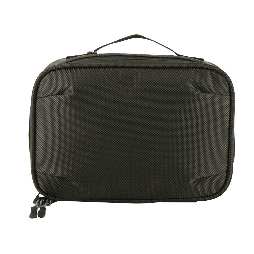 1680D polyester tech pouch with Basecamp logo step and repeat pattern lining (right side only). Internal organization includes elastic bands, zipper pocket, and mesh zipper pocket. Back mesh pocket; side carry handle; light padding; includes decorative Basecamp dog tag. 9" D x 3.625" H x 6" W