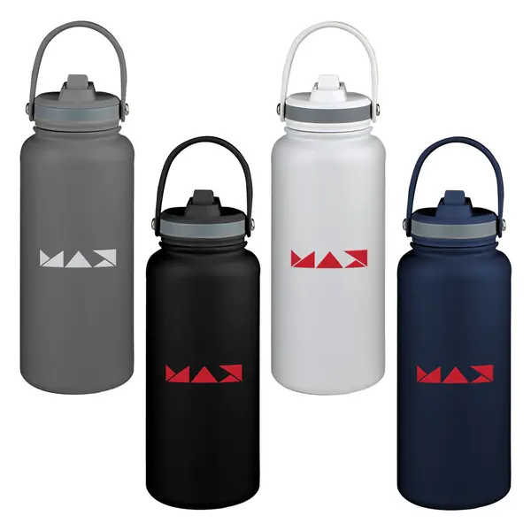 32 oz. wide-mouth vacuum-insulated bottle with a flip-top straw lid and carry handle. Keeps contents colder and hotter longer! Powder coat finish with copper lining; double wall stainless steel. BPA free. Packaged in retail box. 10.5" H x 4.12" D