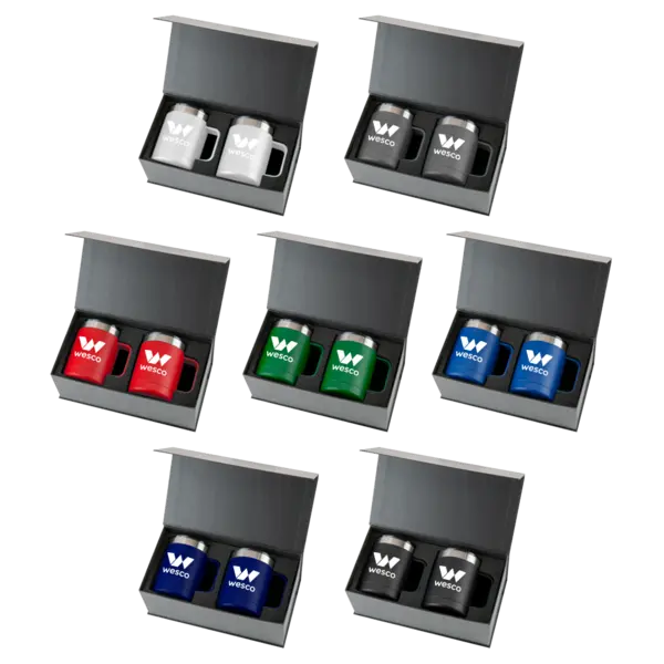 Two piece gift set includes a pair of 15 Oz. double wall vacuum insulated stainless steel Basecamp® Zion Mugs. Packaged in a black premium magnetic flip top gift box.