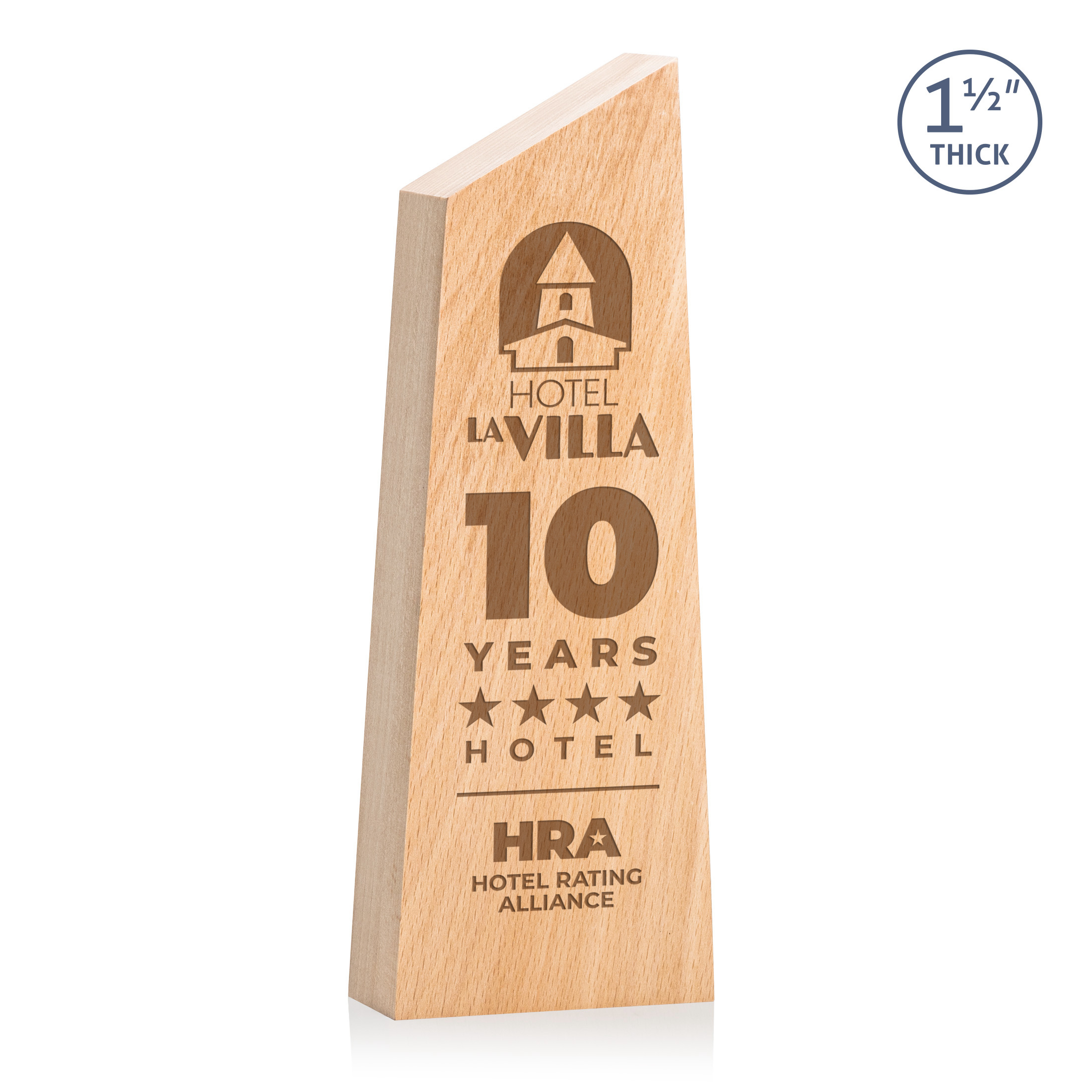 Elevate any recognition moment with this striking beechwood award that combines natural warmth with a bold, contemporary silhouette. Crafted with precision, it features a thick, freestanding design with a distinctive slanted right-facing peak that adds a modern aesthetic. Please note that natural wood material will vary in grain. 9" W x 3.375" H x 1.5" D