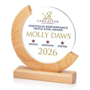 Celebrate achievement with the Beech Eclipse Award, where modern design meets natural warmth. This standout piece showcases a circular Starfire crystal center framed by a partial beechwood ring. The crystal is securely set on a coordinating beechwood base, creating a cohesive presentation that feels elevated and timeless. Please note that natural wood material will vary in grain. 7.75" W x 8.5" H x 2" D