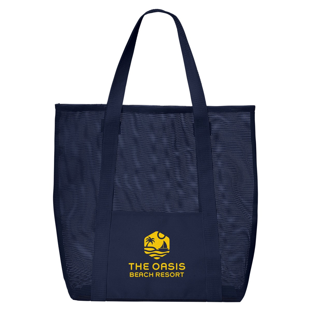 Eco-friendly beach tote made of 600D Recycled Polyester Mesh. Say goodbye to pesky sand sticking to your belongings! Our Beach Mesh Tote allows sand and water to effortlessly pass through, ensuring your beach essentials stay clean and dry! Roomy main compartment with front slash Recycled Polyester pocket for smaller items. Includes 66.5"L Polyester handles. Hand wash with cold water, air dry. Recommended weight tolerance: 17.5 lbs. 62% of this item's total composition is made from recycled materials, and the material itself contains 100% post-consumer recycled content. 14.6000" W x 16.9000" H x 4.1000" D