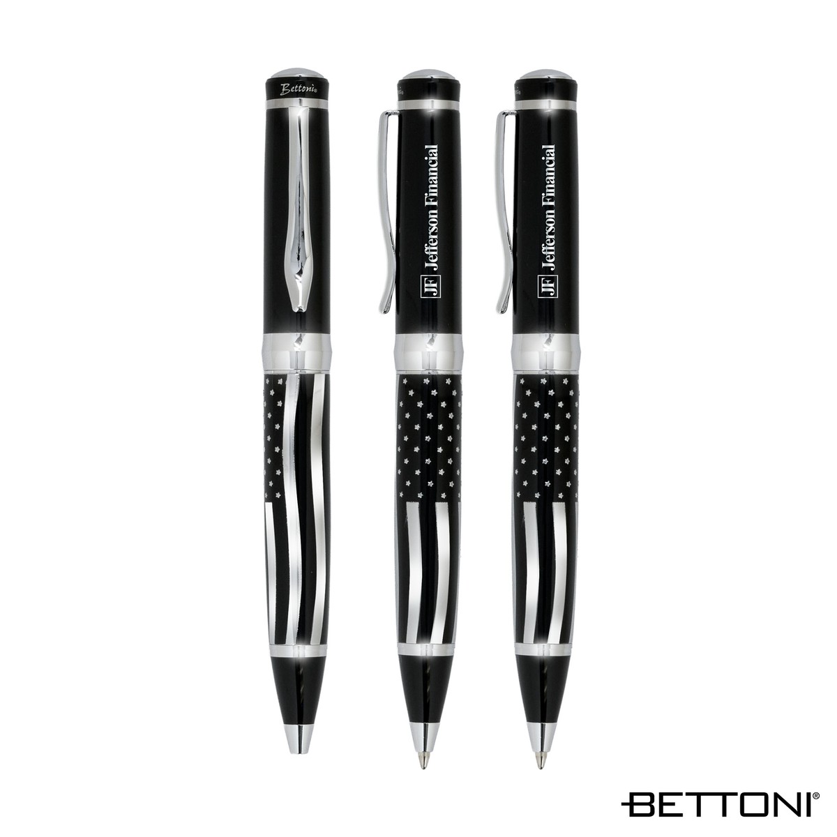 The stylish Americano Ballpoint Pen from Bettoni features a smooth twist-action mechanism for easy use. The chrome barrel showcases a striking USA flag design, complemented by a high-gloss lacquered brass cap for a refined finish. It has a heavyweight brass construction for a balanced feel and comes equipped with a USA-made black ink refill, delivering consistent and reliable writing performance. Each Bettoni writing instrument is packed in a black triangle gift box. Complies with Prop 65. 9/16" W x 5 9/16" H x 11/16" D