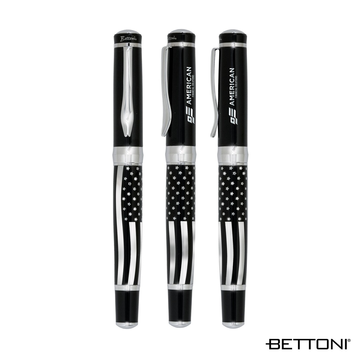 The stylish Americano Rollerball Pen from Bettoni features a sophisticated cap-off design. The chrome barrel showcases a striking USA flag design, complemented by a high-gloss lacquered brass cap for a refined finish. It has a heavyweight brass construction for a balanced feel and comes equipped with a German-made black ink refill, delivering consistent and reliable writing performance. Each Bettoni writing instrument is packed in a black triangle gift box. Complies with Prop 65. 9/16" W x 5 1/2" H x 11/16" D