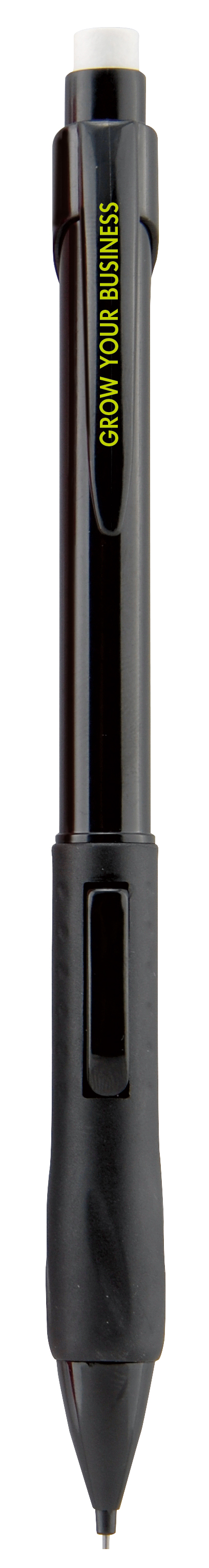 BIC Clic-Matic. Side lead-advance mechanism. Smooth, dark line. Textured rubber grip for comfort and control. Eraser-end. Scantron-certified*. Solid Black, Solid White, Translucent Blue, Translucent Red.4 imprint colors available on barrel, 1 color on clip. 1-color imprint only on barrel with clip imprint. Lead: Includes Three .7mm #2 Graphite Leads.