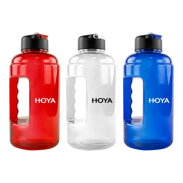 Big Bubba's half gallon water jug is perfect for university and gym giveaways. Features a side grab handle, flip up spout, and a small top carry handle. Flip up spout color matches the transparent body. BPA-Free; handwash recommended. 11.2" H x 5" W