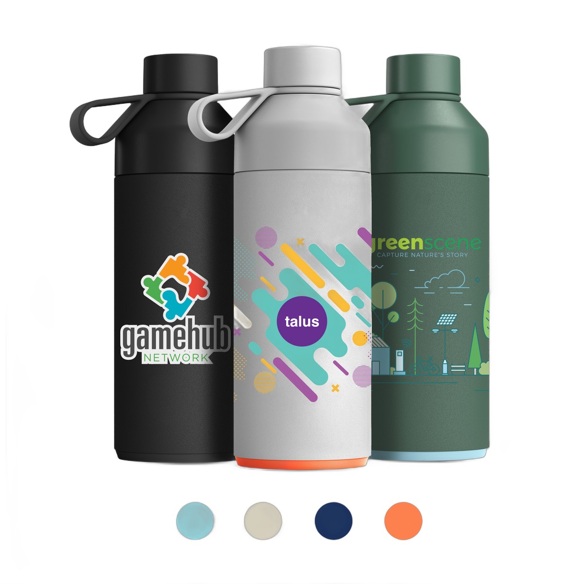 Introducing the Big Ocean Bottle - 34 oz โ This Vacuum Insulated Bottle, made with recycled 304 stainless steel, features a dual opening for easy filling and cleaning, a twist lid with an anti-leak seal, and a silicone loop for convenient carrying and the matte finish adds a touch of sophistication. Equipped with an NFC smart chip for enhanced functionality, this bottle keeps drinks hot for up to 9 hours and cold for 18 hours. Every purchase supports the collection of 25 lbs of ocean-bound plastic, equivalent to the weight of 1000 plastic bottles. Customize your logo with Silkscreen imprint. Complies with Prop 65. 10.63" H x 3.43" W