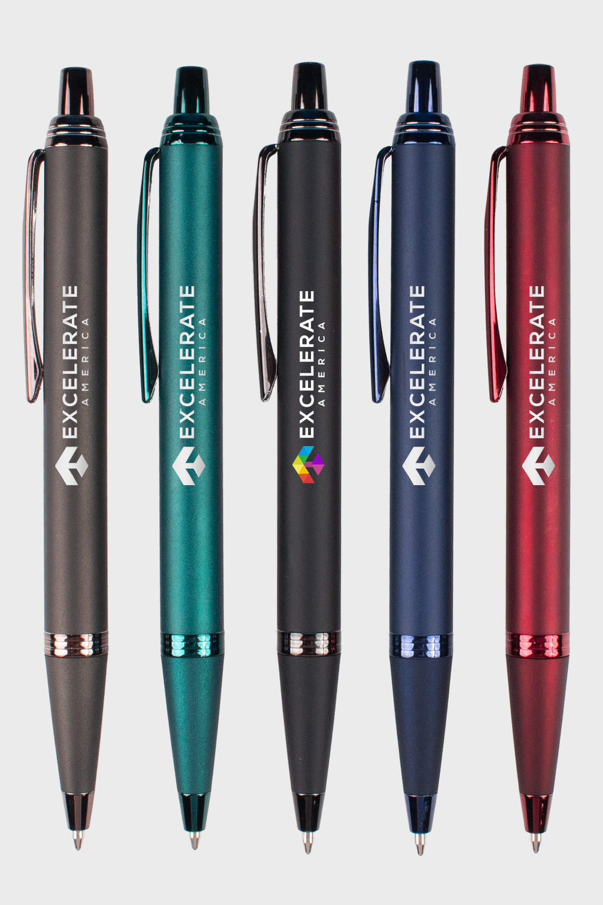 Experience elegance with the Bond Comfort, a sleek European-style executive pen that makes a handsome gift. Its deep shimmering jewel tones, paired with high gloss matching trim, exude sophistication. With a large imprint area to showcase your message and smooth blue ink for effortless writing, it's the perfect blend of style and function. Material: Aluminum Standard Decoration Includes: Laser Engraved All Available Decoration Options: Laser Engraved: 2.5" W x 0.25" H Barrel Expanded Engraving: 2.5" W x 0.375" H Barrel Full Color Digital: 2.5" W x 0.25" H Barrel Straight Line Copy: 2 lines of 40 characters at 8pt Tip Type: Ball Point Mechanism: Push Retractable Standard Packaging: Bulk Tags: Popular, Metal, Gift, Desk, Office, Executive, Advertisement, College, Grade, Writing, Merchandise, Study, High School, University, Essay, List, Home, Pen, Classic, Trade Show