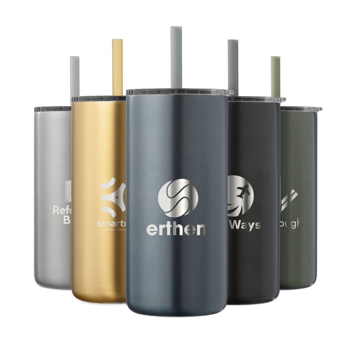 Borealis Recycled Stainless Steel Straw Tumbler - 16 oz. is perfect for enjoying hot and cold drinks on the go. Featuring double-wall vacuum insulation, it keeps hot beverages warm for up to 8 hours and cold drinks chilled for up to 10 hours. Made from recycled stainless steel, the tumbler has a sleek matte metallic finish and includes a spillproof press-on lid and matching color straw for easy sipping. Ideal for daily use, it is both durable and stylish. Not suitable for dishwashers or microwaves. Complies with Prop 65. 7.09" H x 2.95" W