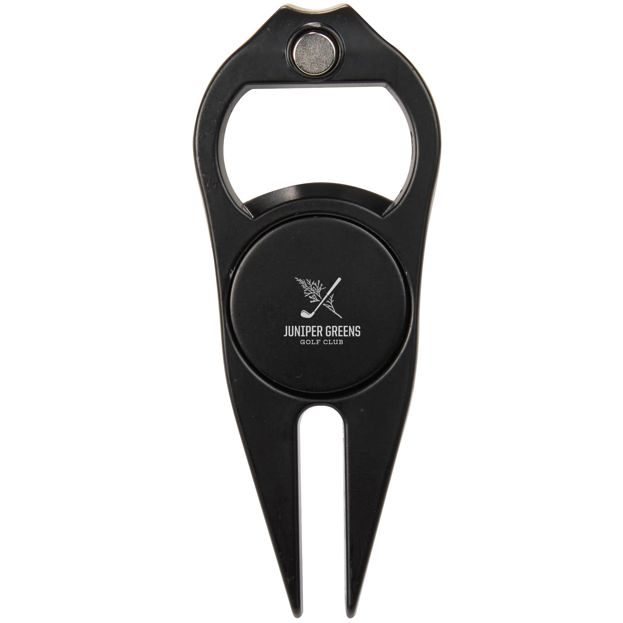 Stay refreshed and ready on the course with the Bottle Opener Divot Tool with Ball Marker! This versatile 3-in-1 tool combines everything you need, from fixing pitch marks to marking your ball and opening a cold beverage. With durable metal construction, it's built to withstand regular use on the green. A small magnet catches the bottle cap once opened, adding convenience to its clever design. 0.15" D x 1.40" W x 3.50" H