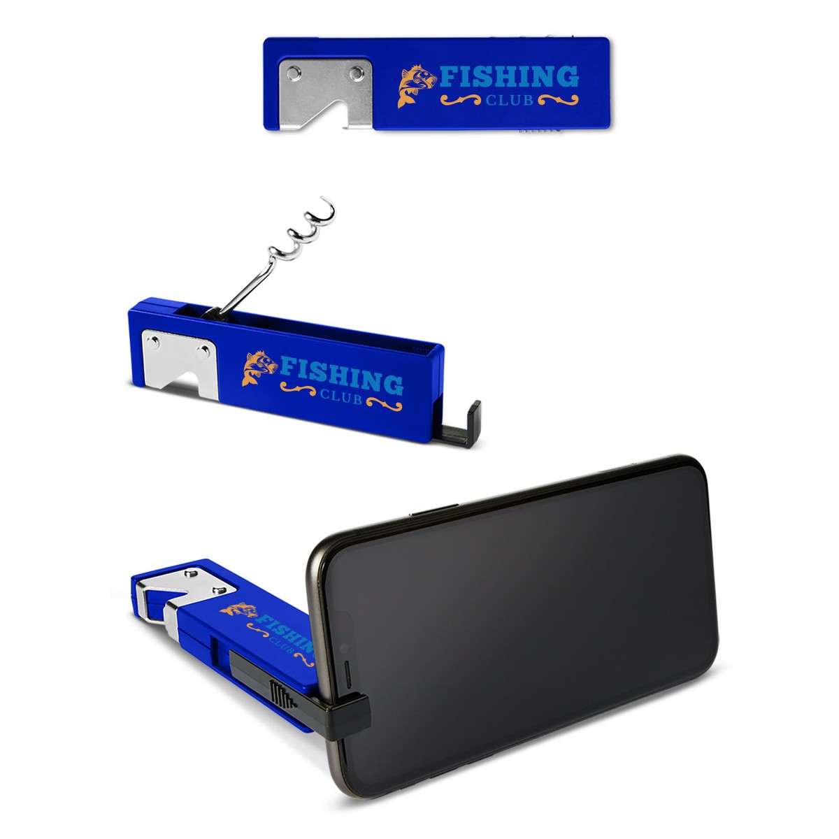 Compact multi-function tool includes bottle opener, corkscrew, and phone stand. Made of ABS Plastic, Iron. Hand-wash only. Instructions included. 4.3" W x 1.125" H x 0.5625" D