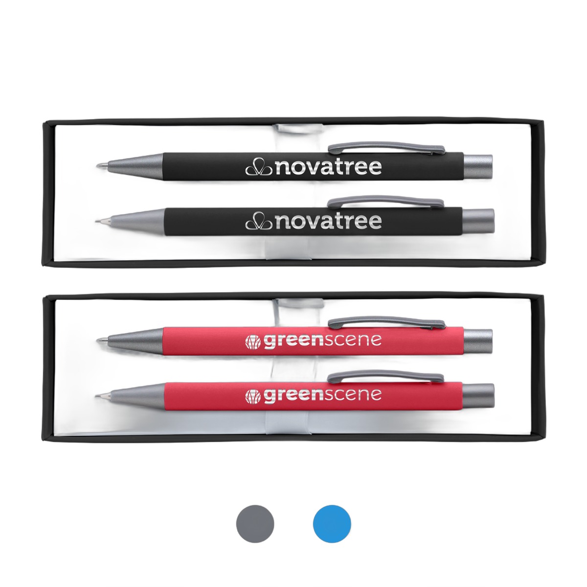 This gift set includes a Bowie ballpoint pen and Bowie mechanical pencil, both featuring the soft-touch rubberized finish. Both pen and pencil will be customized with a full-color imprint (ColorJet technology). Customers are sure to enjoy this gift set. Complies with Prop 65. 6.97" H x 2.05" W x 1.38" D
