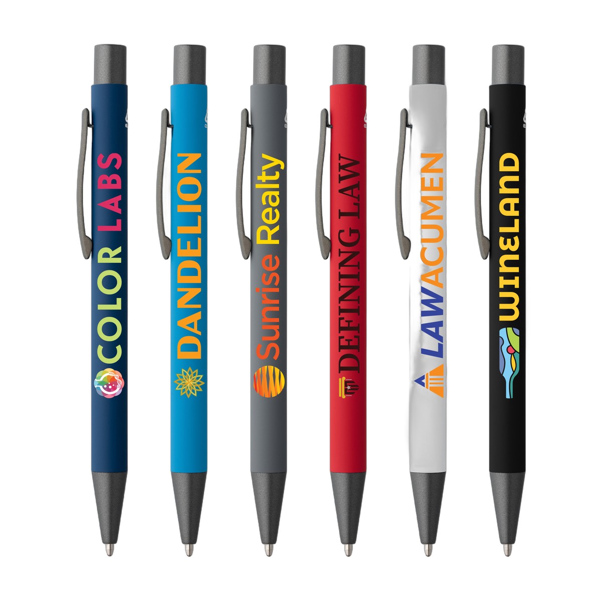 The Bowie Recycled Aluminum Softy Pen features a 100% recycled aluminum barrel with a rubberized finish and silver mirror accents, giving it a stylish, modern look. The sleek design is enhanced by a gunmetal-painted RABS plastic plunger and tip, with a laser-engraved recycled symbol subtly placed opposite the clip. It's equipped with an FMA jumbo slim refill, offering a smooth 1800m write-out with a 1.2mm tip for a reliable, consistent writing experience. Complies with Prop 65. 5.37" W x 0.39" D