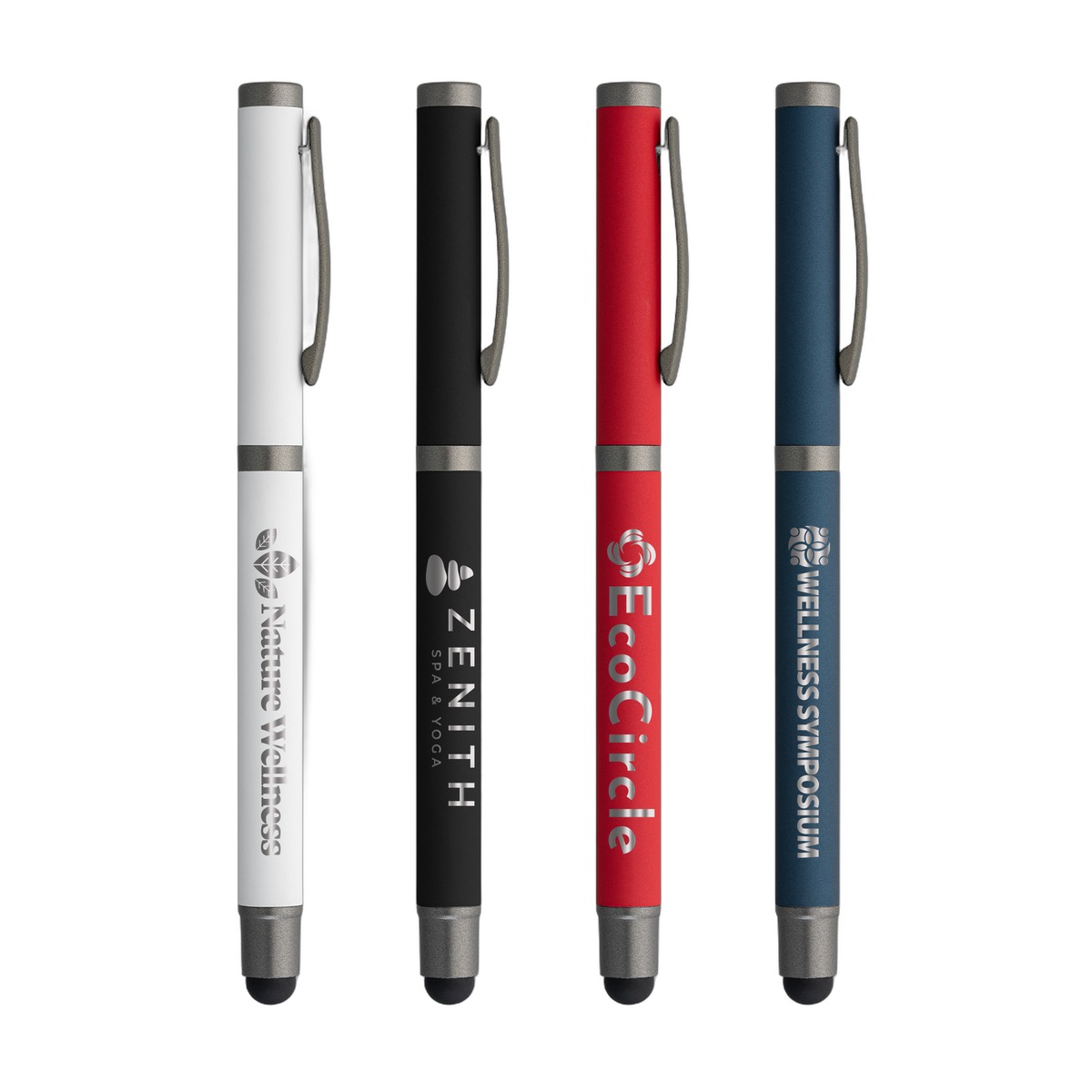 Experience the perfect fusion of modern sophistication with the Bowie Recycled Aluminum Stylus Gel Pen. Crafted with a recycled aluminum barrel featuring a unique shiny gunmetal finish and a soft-touch rubberized coating, this capped pen offers an exceptional grip and a striking gunmetal mirror imprint effect. The thoughtful design includes recycled plastic (rABS) ends, sleek matte gunmetal trim, and a durable steel clip with a matching matte gunmetal finish. Navigate your digital world effortlessly with the integrated black rubber stylus. Inside, a smooth 0.7mm gel refill delivers a consistently fluid writing experience. A subtle recycled symbol is elegantly engraved opposite the clip on the cap. 0.55" H x 5.55" W x 0.55" D