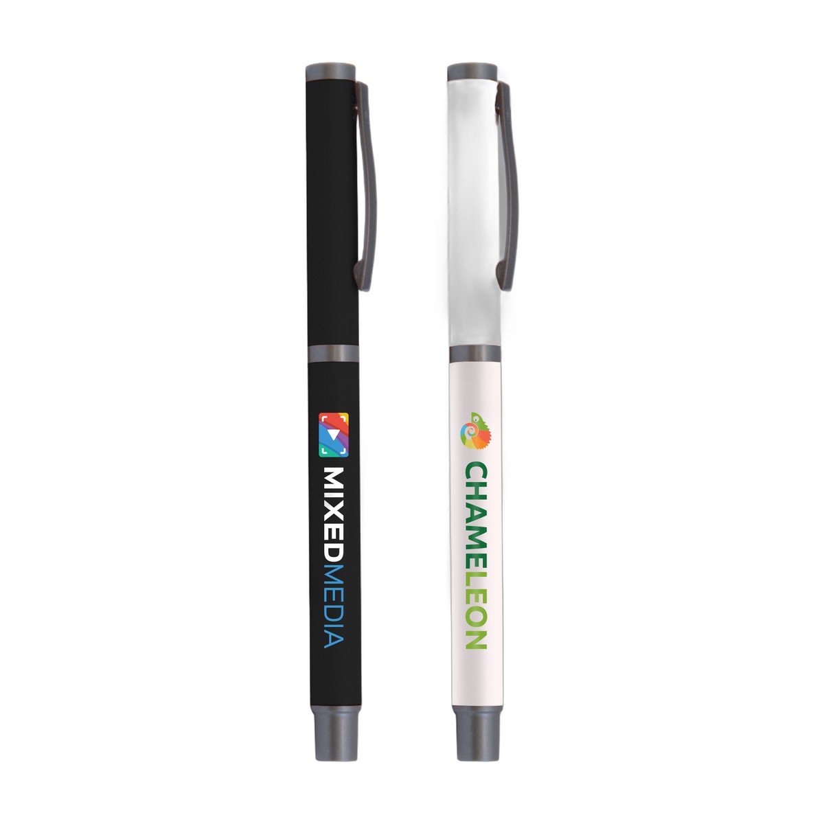 A soft-touch rubberized finish with gunmetal accents modernizes this classic, capped metal pen. The Bowie Rollerball pen delivers a smooth, fluid writing experience, and is designed to impress. . Complies with Prop 65. 5.39" W x 0.39" D
